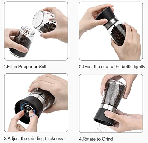 đ„ăEasy To RefillăSalt and Pepper Mills are 5.1â tall and each salt shaker and pepper shaker will hold up to 3/4 cup or 6 oz of the salt, pepper or the spice of your choice. Just unscrew the grinder from the bottle to refill.Manially cranked = No Batteries = Environmentally Friendly salt and pepper grinder sets. Effortlessly twist with your hand grind fresh ingredients!