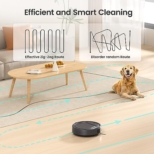 🐶【6 Cleaning Modes】: The smart robot vacuum supports multiple cleaning modes, including: ➊ Arranged cleaning(Zig-zag Route) ➋Random cleaning ➌Spot cleaning ➍Wall cleaning ➎Schedule cleaning ➏Manual control direction. Choose between different modes and suction power as needed via the app, cleaning is so easy.