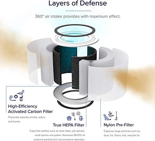 3-stage Filtration System:Cooperation through Nylon pre-filter,activated carbon filter and H13 true HEPA filer,it can efficiently capture large particles such as dust, lint, fibers, hair and trap 99.97% airborne particles such as pet dander, dust mites, pollen and allergies.Also,it absorbs smelly odors and fume, such as smoke and pet odors.