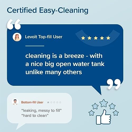 Easy Top-Fill Design: LEVOIT upgraded top-fill design, no need to turn the water tank over and no more spilling water all over the place! Just remove the cover and easily fill the tank.
